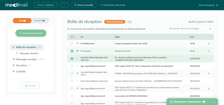 Medimail permet de sécuriser vos échanges, avec tous les professionnels de santé, ainsi qu’avec tous les acteurs impliqués dans le parcours de soin du patient, y compris ceux hors sphère MSSanté (les juges de tutelles, les assistants sociaux, etc.).